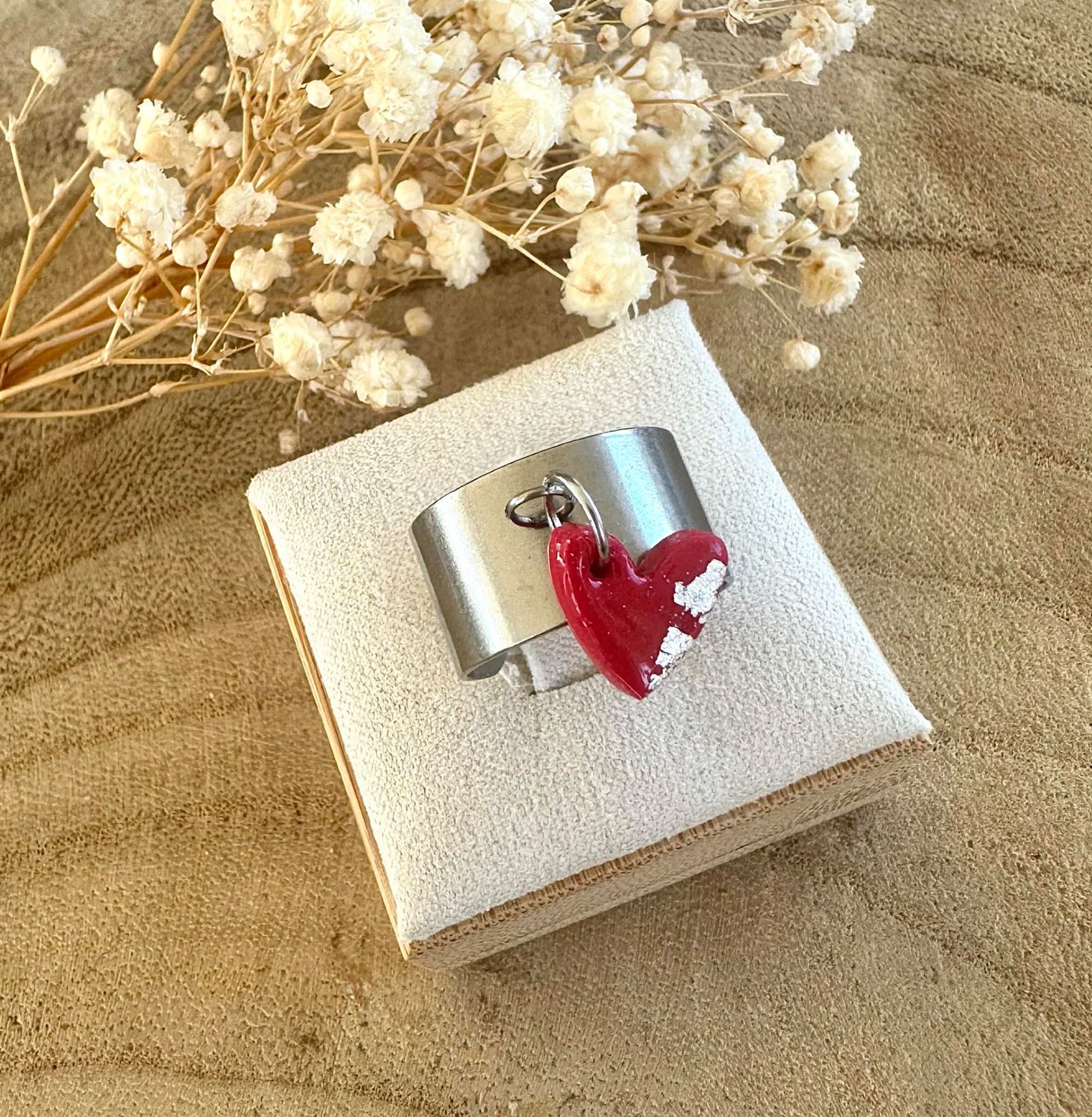 Bague ajustable argentée en acier inoxydable avec son coeur en pâte polymère.