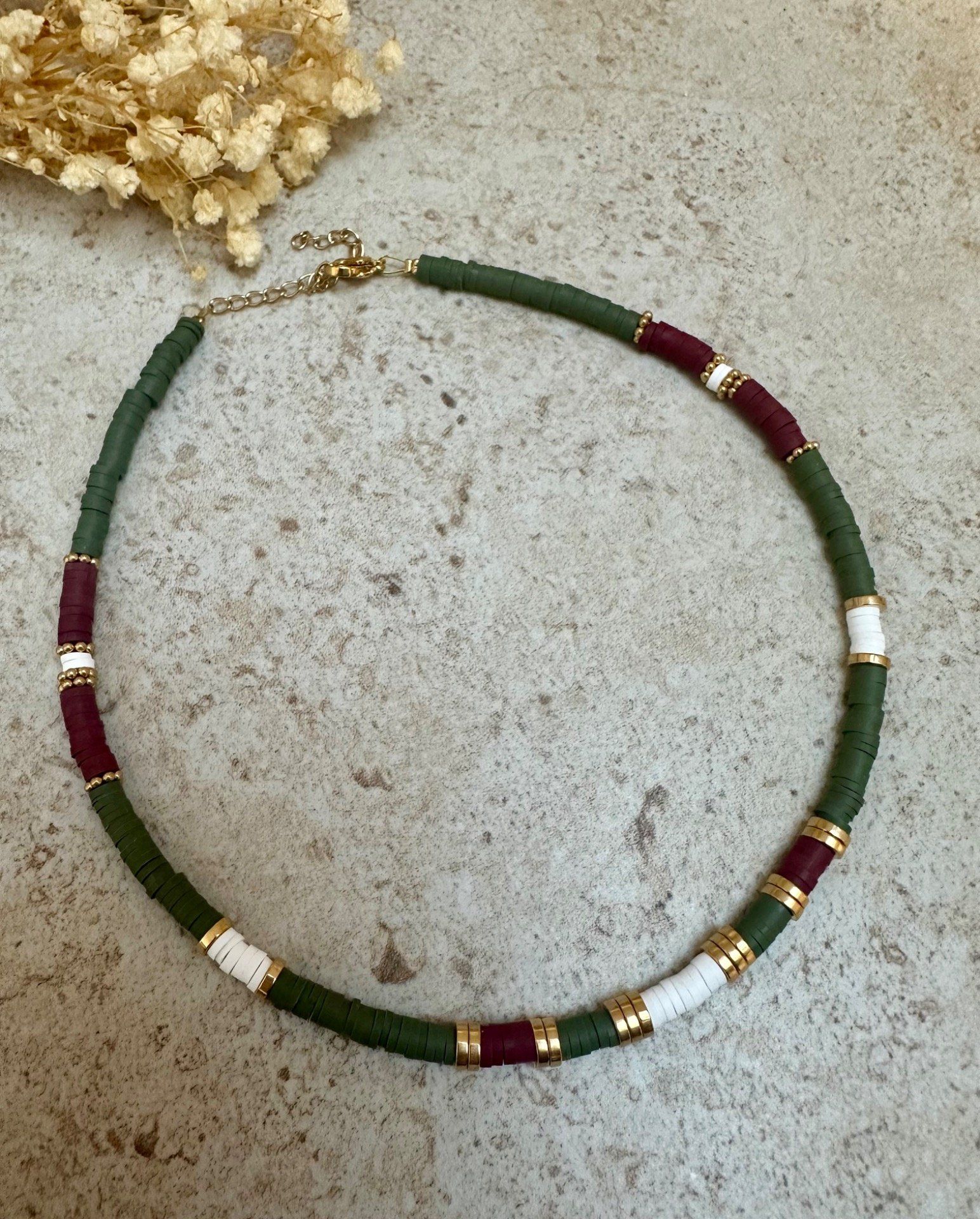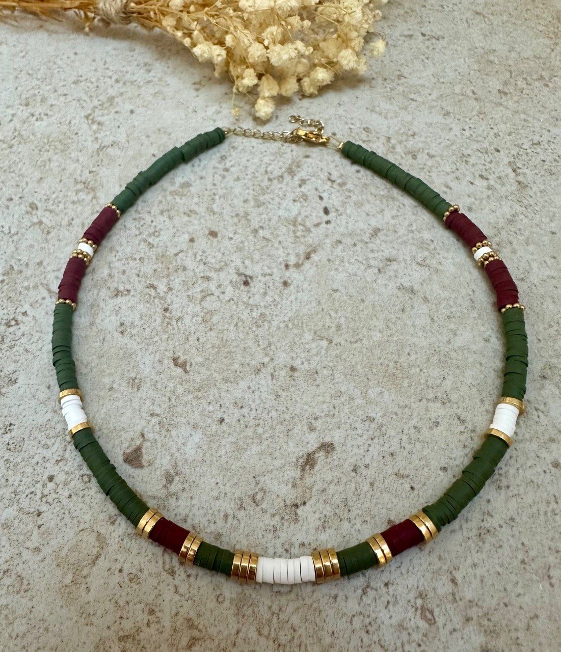 Collier ras de cou avec ses perles rouges, kakis blanches et dorées (en acier inoxydable).